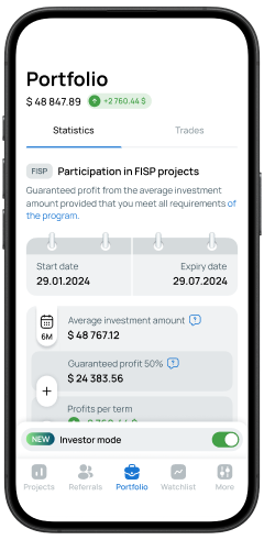 FISP investments are designed for a 6-month term. During the first 6 months of trading, the guaranteed profit is at least 50% of the invested funds. After the first 6 months, the program can be extended for another 6-month period, during which the guaranteed return will be 15%.