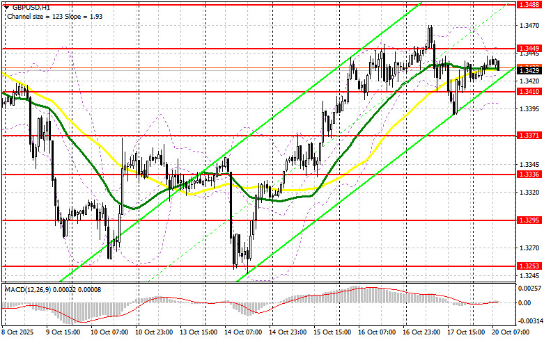 Продавцы проявили себя, но добиться серьезных результатов пока не удалось. Первоначальной задачей медведей на сегодня является защита ближайшего сопротивления 1.3449. Лишь формирование там ложного пробоя будет для меня поводом для продажи фунта с целью снижения в район поддержки 1.3410. Прорыв и обратный тест снизу вверх этого диапазона нанесут более крупный удар по позициям покупателей, приведя к сносу стоп-приказов и открыв путь к 1.3371. Самой дальней целью выступит область 1.3336, где буду фиксировать прибыль. При варианте роста GBP/USD и отсутствия активности на 1.3449 развитие бычьего рынка продолжится. В таком случае продажи лучше отложить до теста сопротивления 1.3488. Открывать там короткие позиции собираюсь лишь на ложном пробое. При отсутствии движения вниз и там я буду продавать GBP/USD сразу на отскок от 1.3525, но лишь в расчете на коррекцию пары вниз на 30-35 пунктов внутри дня.