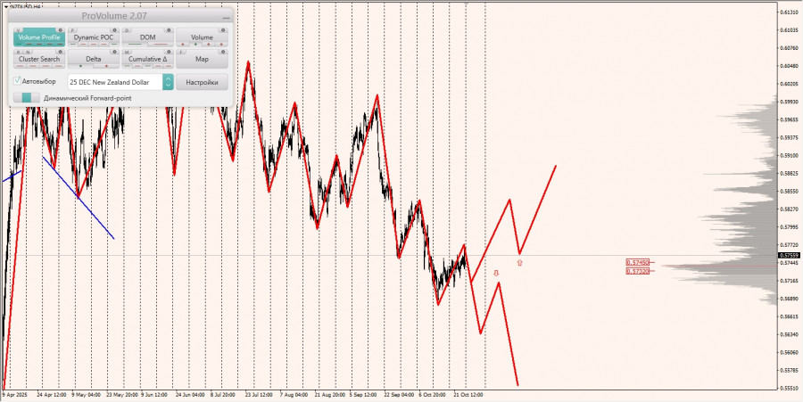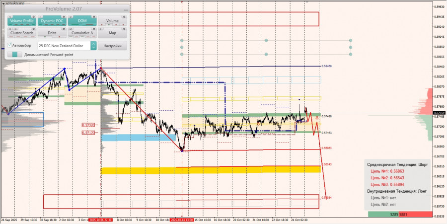 Среднесрочная тенденция: в шорт. Максимальное скопление объемов среднесрочной тенденции расположено в диапазоне по котировкам 0.57170-0.57320. В настоящий момент по паре совершаются инвестиционные операции выше указанного диапазона, что говорит о слабости продавцов.