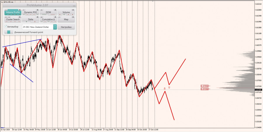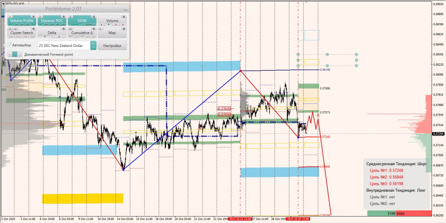 Среднесрочная тенденция: в шорт. Максимальное скопление объемов среднесрочной тенденции расположено в диапазоне по котировкам 0.57550-0.57630. В настоящий момент по паре совершаются инвестиционные операции ниже указанного диапазона, что говорит о силе продавцов.