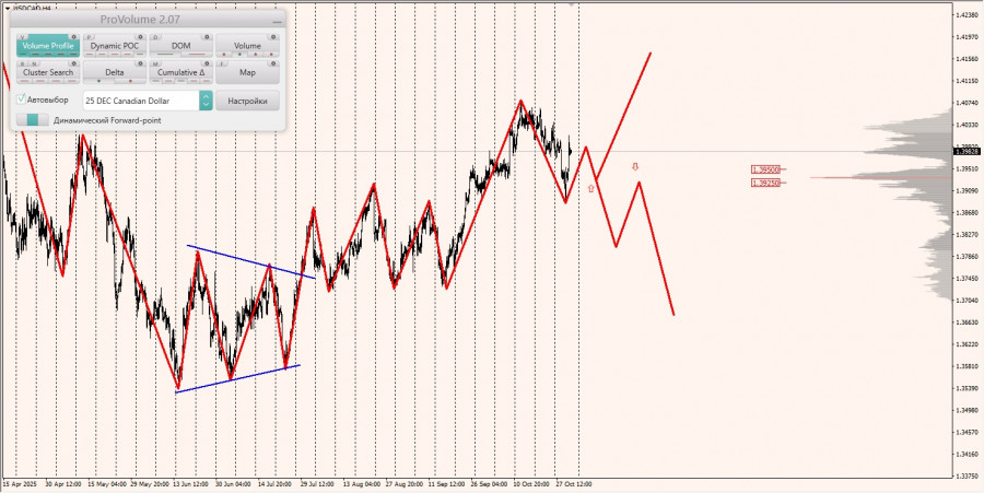 Среднесрочная тенденция: в шорт. Максимальное скопление объемов среднесрочной тенденции расположено в диапазоне по котировкам 1.40280-1.40380. В настоящий момент по паре совершаются инвестиционные операции ниже указанного диапазона, что говорит о силе продавцов.