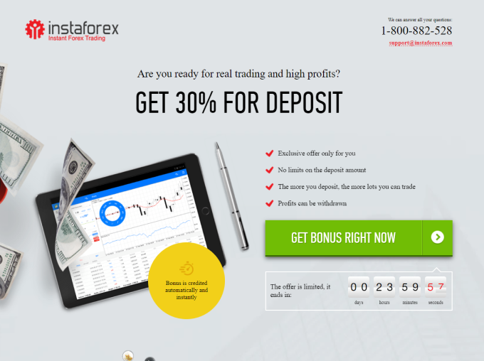 Lucrative offer exclusively for InstaForex clients. Fund your trading account and get +30% to your deposit. The higher a deposit gives an opportunity to make trades of a larger volume. The bonus is provided instantly for any deposit, with no limits.