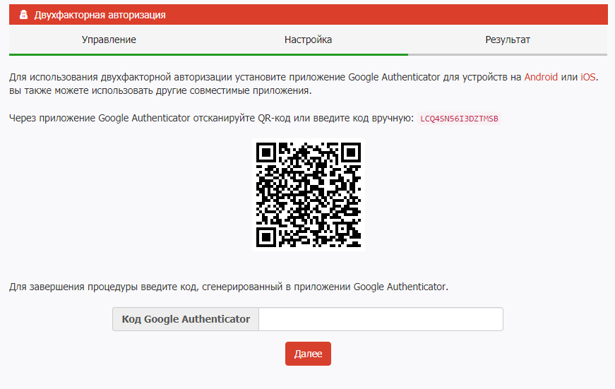 2. Далее скачайте приложение Google Authenticator (или совместимый аналог) на используемое устройство, отсканируйте с его помощью QR-код (либо введите вручную выделенный красным код) и затем подтвердите активацию, введя шестизначный код из самого приложения на устройстве.