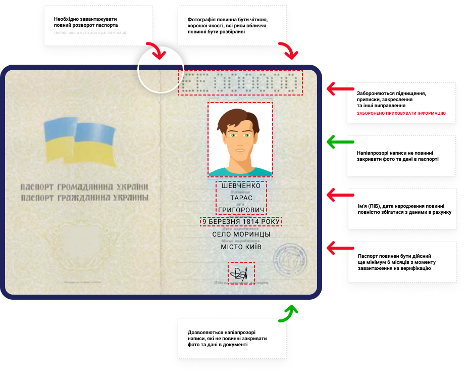 Якщо Ви плануєте поповнення/зняття коштів за допомогою банківської картки/банківського переказу, фото документів необхідно завантажувати без будь-яких написів. Це вимога платіжних агрегаторів.